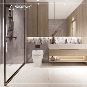 - Gạch ốp tường: Tường nên được ốp các tông màu tiệp với gạch nền hoặc sáng hơn để tạo sự liền mạch và không gian mở. Có thể chọn gạch ốp tường 30x60cm, 40x80cm ốp ngang để “kéo dài” phòng. Hạn chế ốp quá nhiều tường, chỉ nên ốp một mảng tường tạo điểm nhấn nếu cần, với màu sắc hoặc họa tiết nhẹ nhàng.